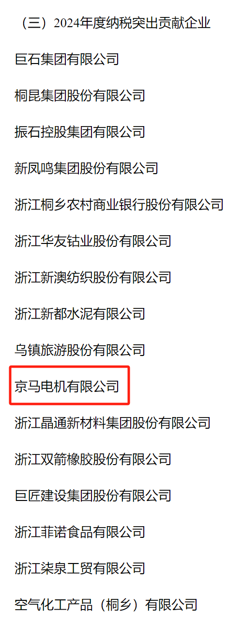 2025年2月6日,桐鄉(xiāng)市政府正式發(fā)布了《全市三級(jí)干部表彰大會(huì)和通報(bào)表?yè)P(yáng)名單》,京馬電機(jī)榮獲桐鄉(xiāng)市2024年納稅突出貢獻(xiàn)企業(yè)和數(shù)字經(jīng)濟(jì)發(fā)展優(yōu)秀企業(yè)二項(xiàng)榮譽(yù)稱號(hào)。